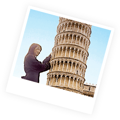 世界的に知られるピサの斜塔は世界遺産「ピサのドゥオモ広場」を構成するピサ大聖堂の鐘楼。大聖堂、洗礼堂と並んで広場に聳え、高さは地上55.86mを誇ります。明らかに傾いた斜塔を背景に、