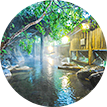 深い森の中、霧島神宮のお膝元に湧き出る温泉。すぐそばには霧島連山がそびえ、一帯にはたくさんの火山地形があります。鹿児島でありながら冬には雪が降ることもあり、タイミングが良ければ雪化粧をした山々を一望することができます。