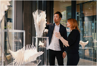 3DCADやプログラミング、AIを活用しながら、伝統的な陶芸技法と最先端の建築テクノロジーの融合を目指し、新しい工芸の価値を世界に発信する。代表作「Bone Flower」は、白い骨が花を咲かせたようなかたちで、儚さとダイナミックさが共存。「空間を構成する工芸」と評され、金沢21世紀美術館に立体作家としては史上最年少で永久所蔵されている。