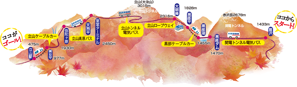 - ロープを支える鉄塔が途中に無いワンスパン方式としては、日本最長の全長1710mの立山ロープウェイ。3000m級の山々や黒部ダムが眺められる360度のパノラマは「動く展望台」と称され、3000m級の山々や、黒部ダムが眺められる景色はは壮観の一言。そのスケールは他に類を見ないものです。
