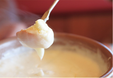 チーズを溶かして食材を浸して食べるスタイルの料理です。通常、グリュイエールやエメンタールなどのチーズを白ワインと一緒に溶かし、ガーリックやキルシュ(チェリーブランデー)で風味を加えます。パンや野菜、肉などをフォークに刺して、溶けたチーズに絡めて食べるのが特徴です。
