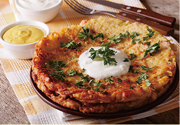 伝統的なジャガイモ料理で、細かくすりおろしたジャガイモをバターで焼き上げたものです。外はカリッと香ばしく、内側はホクホクとした食感が特徴。朝食や昼食に食べられることが多く、ベーコンやチーズ、卵などを加えることもあります。地域によっては、具材を変えたバリエーションも楽しめ、シンプルながら深い味わいの一品です。
